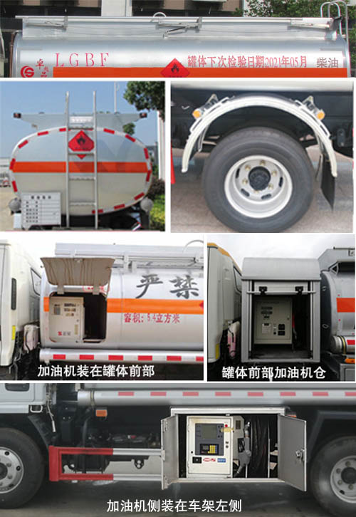 | 配置 | 1、該車(chē)適用于危險(xiǎn)品運(yùn)輸,運(yùn)送危險(xiǎn)貨物車(chē)輛類(lèi)型為:FL型,類(lèi)項(xiàng)號(hào):3。運(yùn)輸介質(zhì):柴油、煤油、汽油,密度:830、800、700千克/立方米,罐體有效容積4.5立方米,罐體外形尺寸(長(zhǎng)×寬×高)(mm):①加油機(jī)側(cè)裝在車(chē)架左側(cè):3800×1600×1000,②加油機(jī)裝在罐體前部:3800×1750×1220(加油機(jī)倉(cāng)長(zhǎng)800);③選裝罐體前加油機(jī)倉(cāng):3000×1750×1220。罐體上部選裝折疊護(hù)欄、選裝無(wú)上走道;選裝弧形擋泥板。2、側(cè)防護(hù)采用冷彎型鋼/Q235,螺栓連接。后防護(hù)采用冷彎型鋼/Q235,焊接,截面高100mm,截面寬50mm,下邊緣離地高450mm。加油機(jī)型號(hào)及生產(chǎn)企業(yè):BL1111Z/珠海市貝林加油設(shè)備有限公司中山分公司,HS1812B/托肯恒山科技(廣州)有限公司,SKES-1112/恒和嘉華科技有限公司(上海伯萊機(jī)械有限公司),SK20QF-111A、SK20QF-222A/鄭州三金石油設(shè)備制造有限公司,CS20D1110F/正星科技有限公司,JSK-70B1121CZ,JSK-70B1121C,JSK45B1121C/穩(wěn)恩佳力佳(北京)石油化工設(shè)備有限公司, ZH6444/佛山市眾澤機(jī)電科技有限公司, XTST121BF1/邢臺(tái)正潤(rùn)通科技發(fā)展有限公司,TA-1111KFJ/沈陽(yáng)航天新陽(yáng)機(jī)電有限公司。3、隨底盤(pán)選裝前面罩,前保險(xiǎn)杠,前組合燈具,選裝左右油箱位置。僅選用排氣管前置、限速裝置(限速80km/h)、前輪盤(pán)式制動(dòng)及子午線輪胎的底盤(pán),安裝帶有衛(wèi)星定位功能的行駛記錄儀。ABS廠家及型號(hào):襄陽(yáng)東風(fēng)隆誠(chéng)機(jī)械有限責(zé)任公司/ABS/ASR-24V-4S/4M。轉(zhuǎn)向輪安裝輪胎爆胎應(yīng)急防護(hù)裝置。 | ||