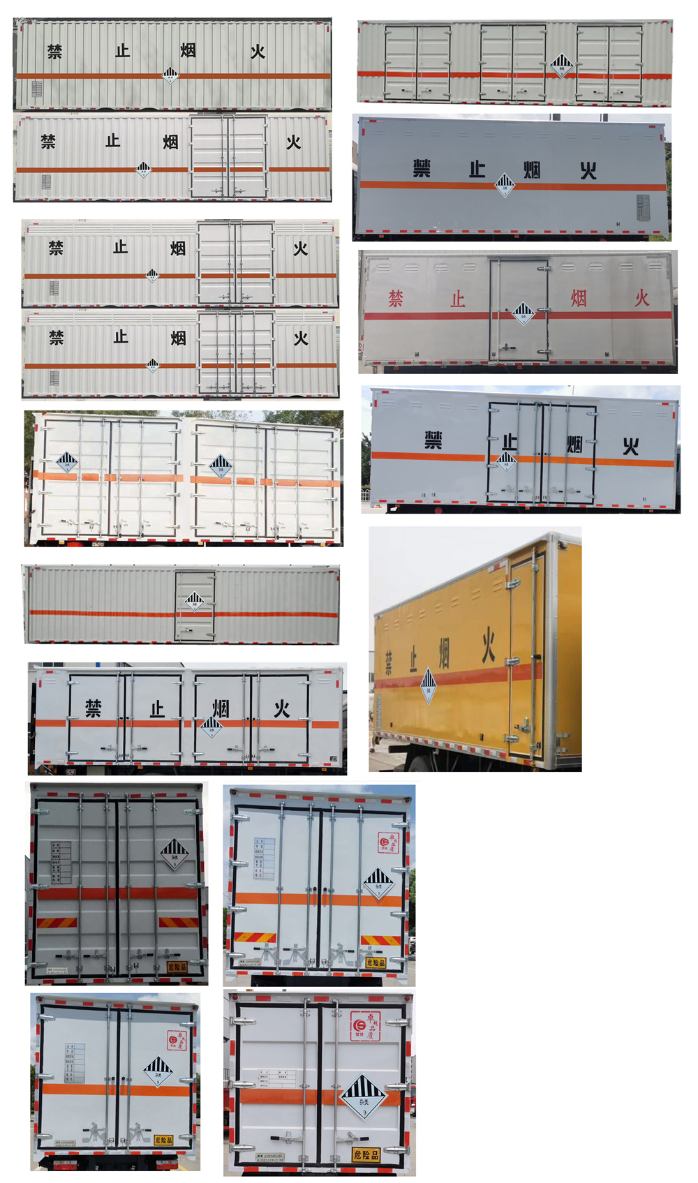 其它 | 1、該車適用于危險品運輸,類項號:9。廂體頂部封閉,不可開啟。2、側(cè)、后防護材料均為Q235,側(cè)防護螺栓連接;后防護焊接,截面尺寸120×50mm,下邊緣離地高450mm。3、僅采用軸距(mm):4700,5150。僅選用排氣管前置、限速裝置(限速80km/h)、前輪盤式制動及子午線輪胎的底盤;安裝帶有衛(wèi)星定位功能的行駛記錄儀;ABS系統(tǒng)型號/生產(chǎn)企業(yè)對應(yīng)關(guān)系:ABS-E/威伯科汽車控制系統(tǒng)(中國)有限公司;ABS/ASR-24V-4S/4M/東科克諾爾商用車制動系統(tǒng)(十堰)有限公司;CM4XL-4S/4M/廣州瑞立科密汽車電子股份有限公司;3550D-1010/東科克諾爾商用車制動系統(tǒng)(十堰)有限公司.采用的發(fā)動機與油耗值(L/100Km)對應(yīng)關(guān)系為:F4.5NS6B220/24.4,B6.2NS6B210/26。該車轉(zhuǎn)向輪安裝輪胎爆胎應(yīng)急防護裝置,后軸采用空氣懸架。該車型可選裝ETC車載裝置.隨底盤選裝駕駛室。廂體側(cè)面選裝開門型式及位置,選裝不帶側(cè)開門,選裝瓦楞板或平板結(jié)構(gòu);廂體側(cè)面板選裝開百葉窗。選裝后尾板時,后防護材料為Q235,焊接,截面尺寸120×50mm,下邊緣離地高450mm。尾板收起狀態(tài)水平長度為290mm,尾板質(zhì)量為550kg。選裝制冷機組,選裝燃油箱,電瓶,尿素罐,后處理,儲氣筒左右安裝位置。 | ||